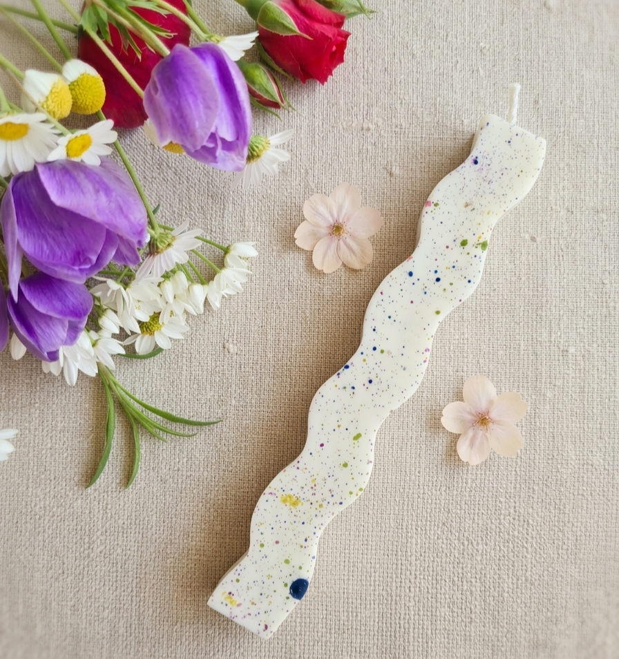 Χειροποίητη φυτική αρωματική λαμπάδα με μοντέρνες πιτσιλιές που δημιουργούν ένα ιδιαίτερο, artistic αποτέλεσμα.